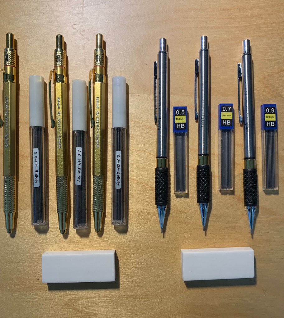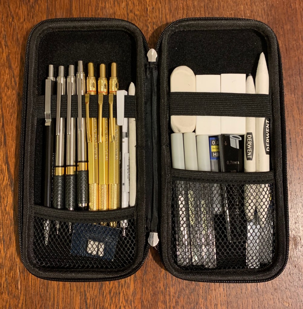 I wanted a hard case to provide the contents with some protection, and I’m pleased with this one as all of the mechanical pencils, leads, erasures, and the paper stumps fit inside it: